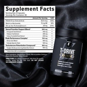 Both T-Drive™ and T-Drive™ Magnum help boost testosterone levels to achieve peak masculinity and help overall male vitality. T-Drive™ Magnum features clinically proven testosterone-boosting ingredients, igniting your body's testosterone production to achieve optimal levels of free and total T. With powerful ingredients like Fadogia Agrestis and Tongkat Ali, scientifically proven to stimulate testes for heightened testosterone production and estrogen prevention, expect an amplified sex drive, improved erectile function, a bolstered sense of confidence, and more!"