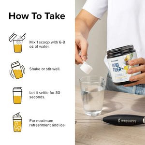 Add one scoop of Inno Fiber+ to 6-8 oz of cold water. Starting out? Use half a scoop for the first 3-5 days.