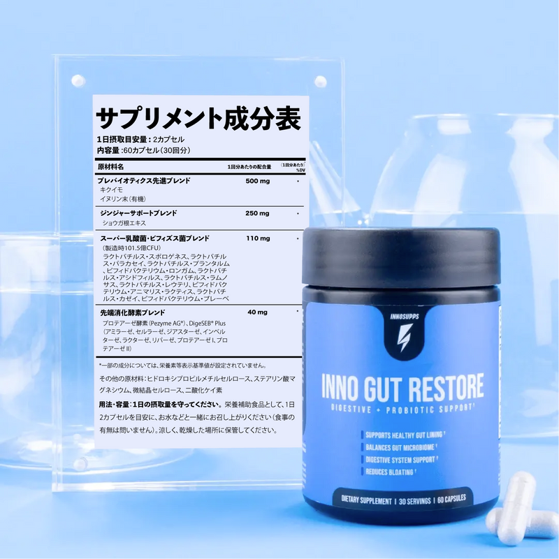 Inno Gut Restore (イノ・ガット・リストア)で、無理なく取り組める新しい体重管理を!この先進的なプロバイオティクス菌株は、わずか6ヶ月で体重コントロールが期待できるとされています。このスーパープレバイオティクス+プロバイオティクスのブレンドが、消化器系と腸内の善玉菌のバランスを整え、代謝をサポートします。食欲の乱れを和らげ、無理なく体重管理に取り組めるように後押しします。