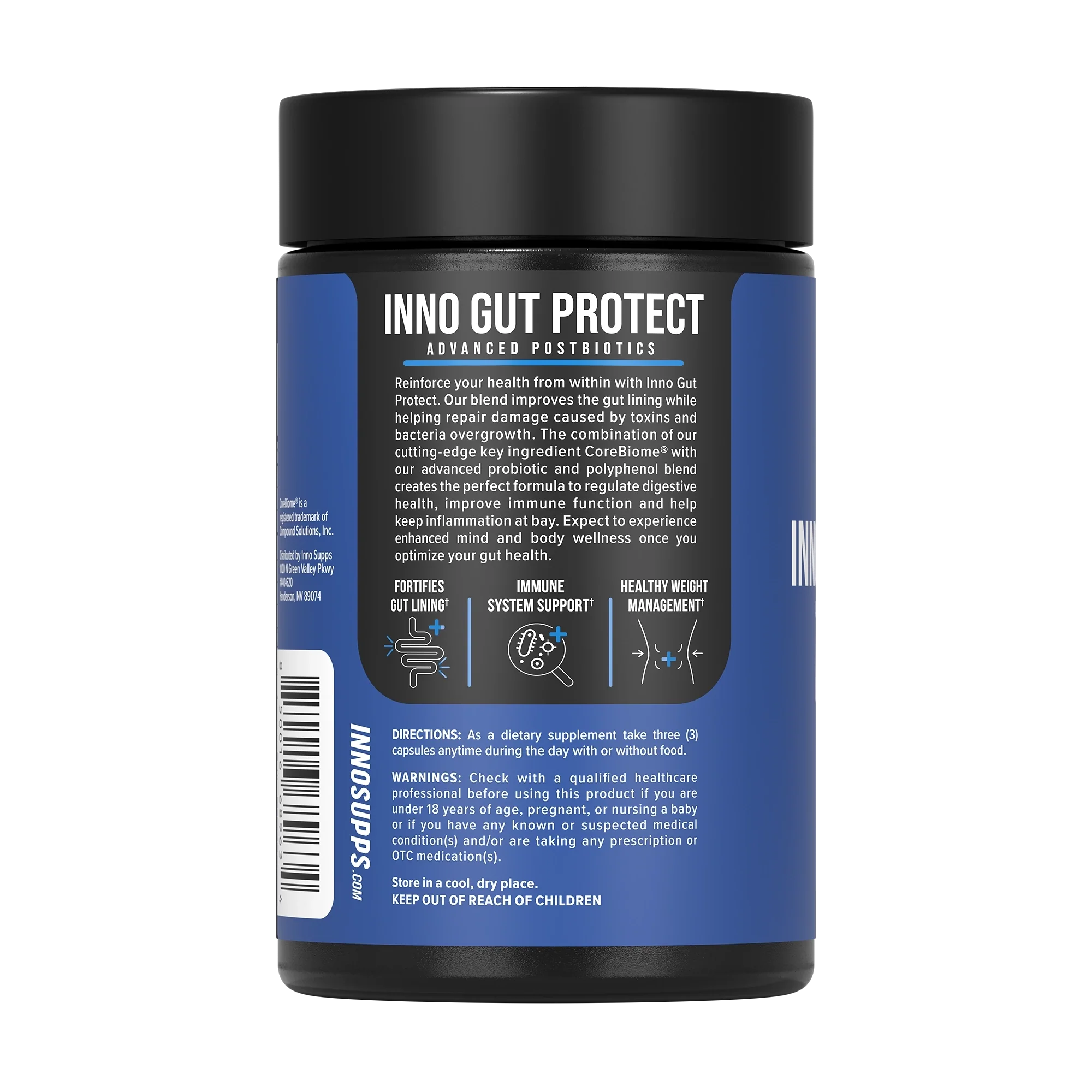 Inno Gut Protect is a postbiotic and works to strengthen the gut lining. A fortified gut lining helps maintain the benefits you experience from prebiotics and probiotics. Research also suggests postbiotics may help boost your immune system, regulate inflammatory responses and support weight loss and maintenance.