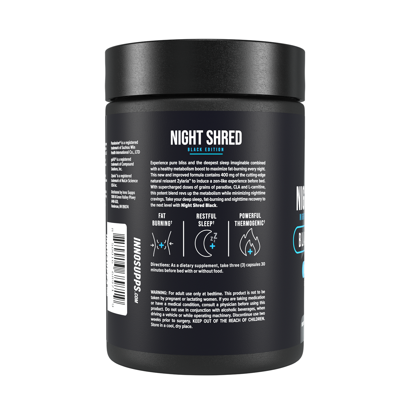 Night Shred Black contains the most revolutionary and cutting-edge sleep-inducing ingredient, Zylaria™, along with powerful metabolism-boosting ingredients to curb nighttime cravings and accelerate the fat‐burning process.