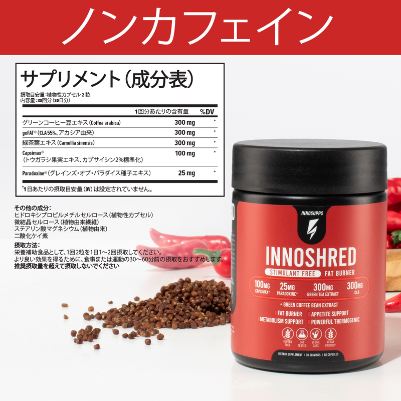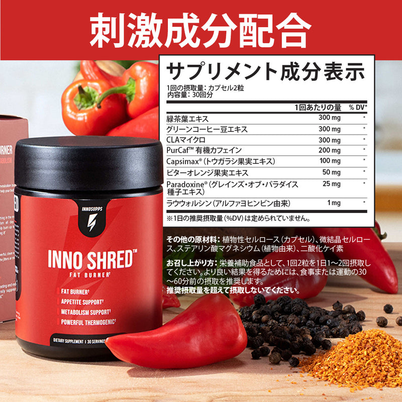 カフェインに敏感な方は、まずは1カプセルから様子を見るか、刺激成分(カフェインなど)を含まないInno Shredスティムフリーのご使用もご検討ください。